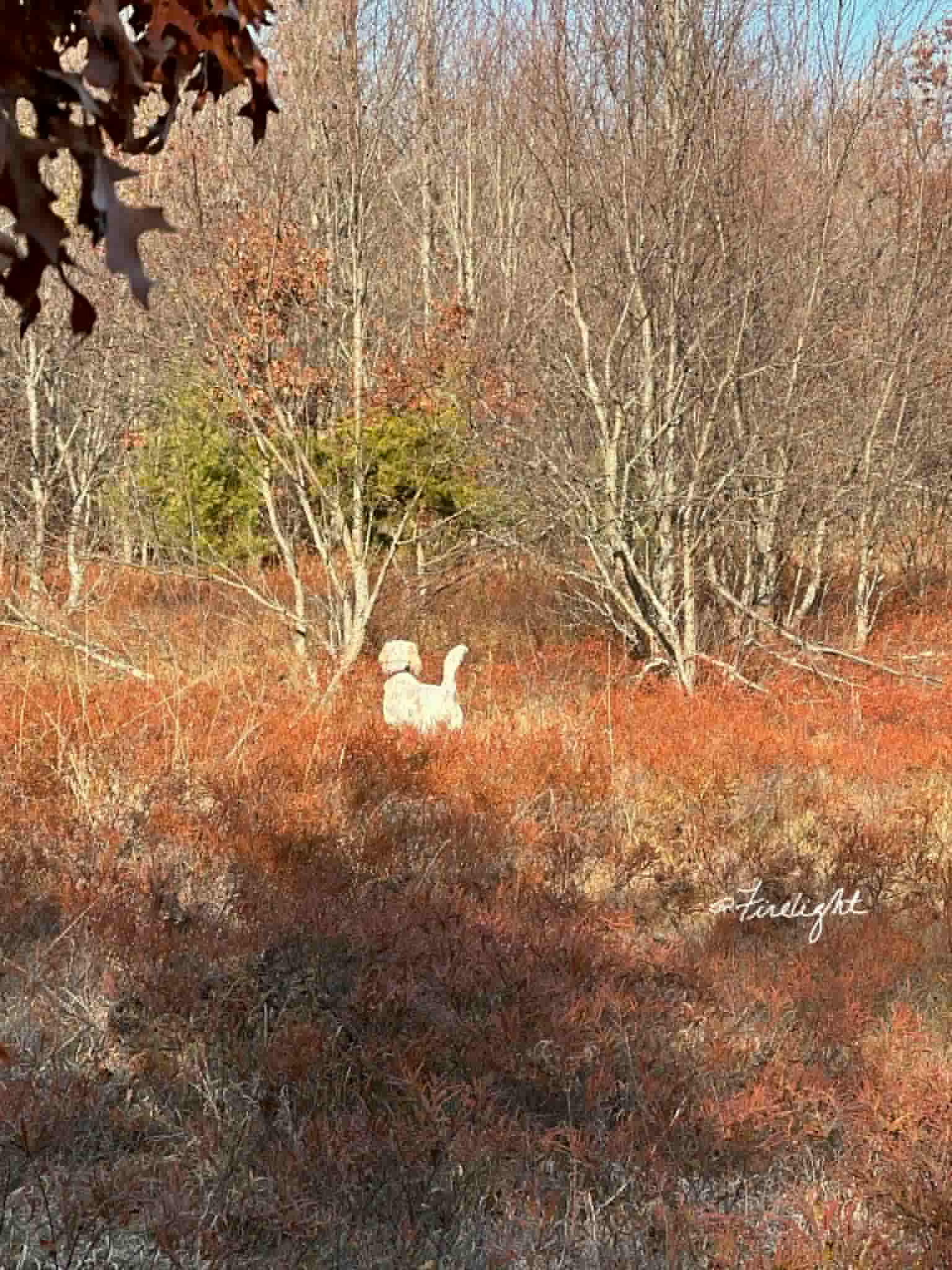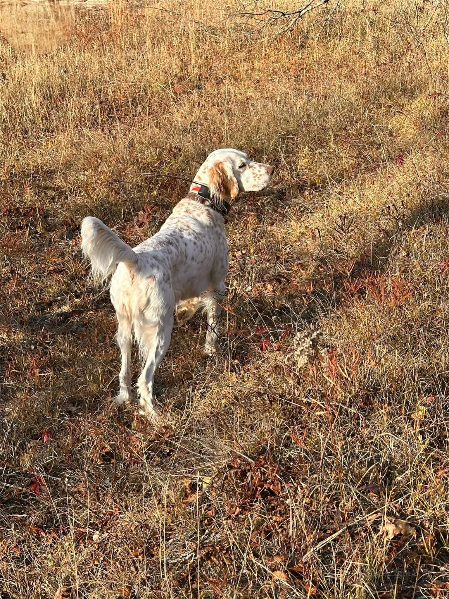 Firelight Spice is a beautiful 45 lb granddaughter of my late Seth. Early on Spice and my beloved friend Randy developed a special bond and she went to live at Randy’s farm with Seth, FL Luke and FL Deacon, and the Labs and farm dogs. She holds the special role of the only female setter welcomed in a household that prefers boys; she is sweet and affectionate yet definately not a pushover with all the boys. Spice started her career on the woodcock and the semi-wild released quail on the farm, showing a great deal of desire and is a brush beater despite being a bit smaller. On her first trip back up here to the Michigan she quickly caught on to handling grouse and the thick woods. She requires very little handling, truly hunting for the gun, ranging 40-100 yds . OFA Good Spice will be spending Fall, 2025 with me in Michigan to hunt grouse and to be bred and raise a litter.
