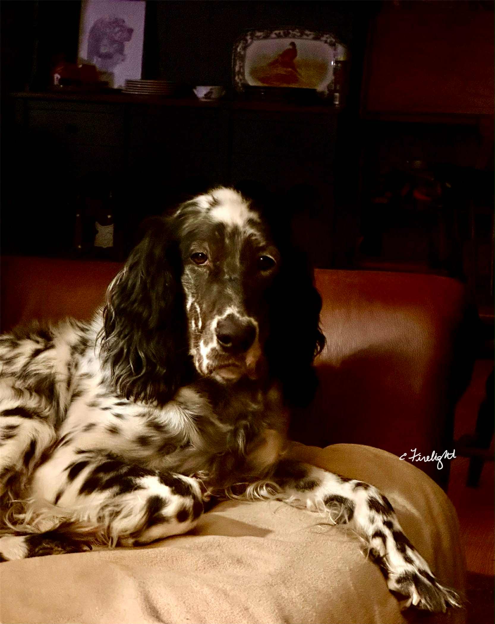 Meet Firelight Moondance, 7th generation Firelight. The breeding that produced Dance had been in my mind and on paper for years. Her mother is Kate and her sire is Parker (4 generation Firelight, brother to my Storm.) Parker’s mother was my beloved Tweed and his sire was Pinecoble Talus. This blend of talent, beauty and amazing personalities gave me Dance. She has a beautiful high style about her including on birds and a strong natural, gentle retrieve to hand. She hunts a little closer than some of mine, 40-50 yards in the woods. Very sweet and affectionate. 49 pounds. OFA Excellent/normal.